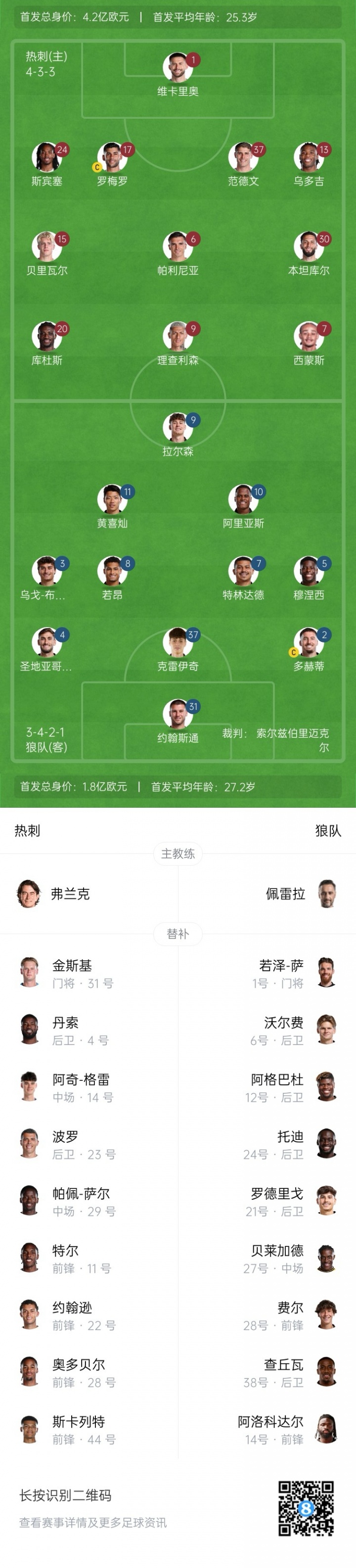 热刺首发:1-维卡里奥、13-乌多吉、17-罗梅罗、24-斯宾塞、37-范德文、6-帕利尼亚、7-西蒙斯、15-贝里瓦尔、30-本坦库尔、9-理查利森、20-库杜斯