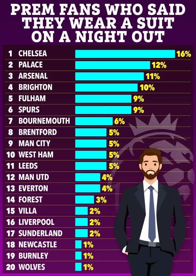 相比之下,纽卡斯尔、伯恩利和狼队的球迷则排名垫底,仅有1%的人会选择正装出行。