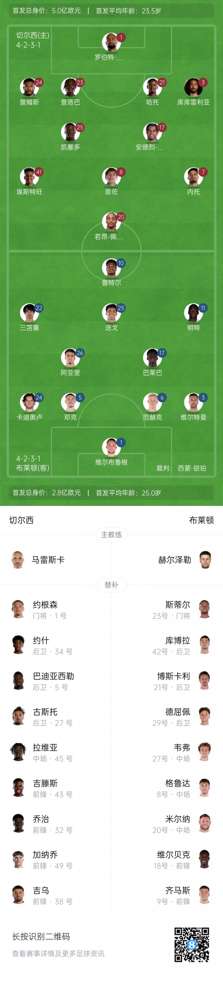 切尔西首发:1-桑切斯、24-詹姆斯、23-查洛巴、21-哈托、3-库库雷利亚、17-桑托斯、25-凯塞多、8-恩佐、41-埃斯特旺、7-内托、20-若昂-佩德罗